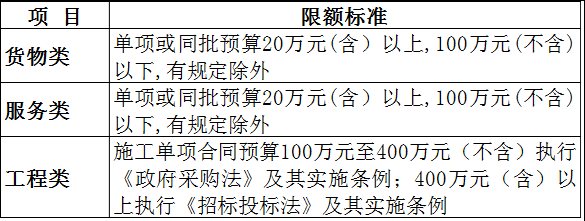 采購貨物、服務(wù)和工程類項目限額標準為:貨物、服務(wù)類項目單項或批量采購預(yù)算金額達到20萬元(含20萬元);工程類項目采購預(yù)算金額達到50萬元(含50萬元)。